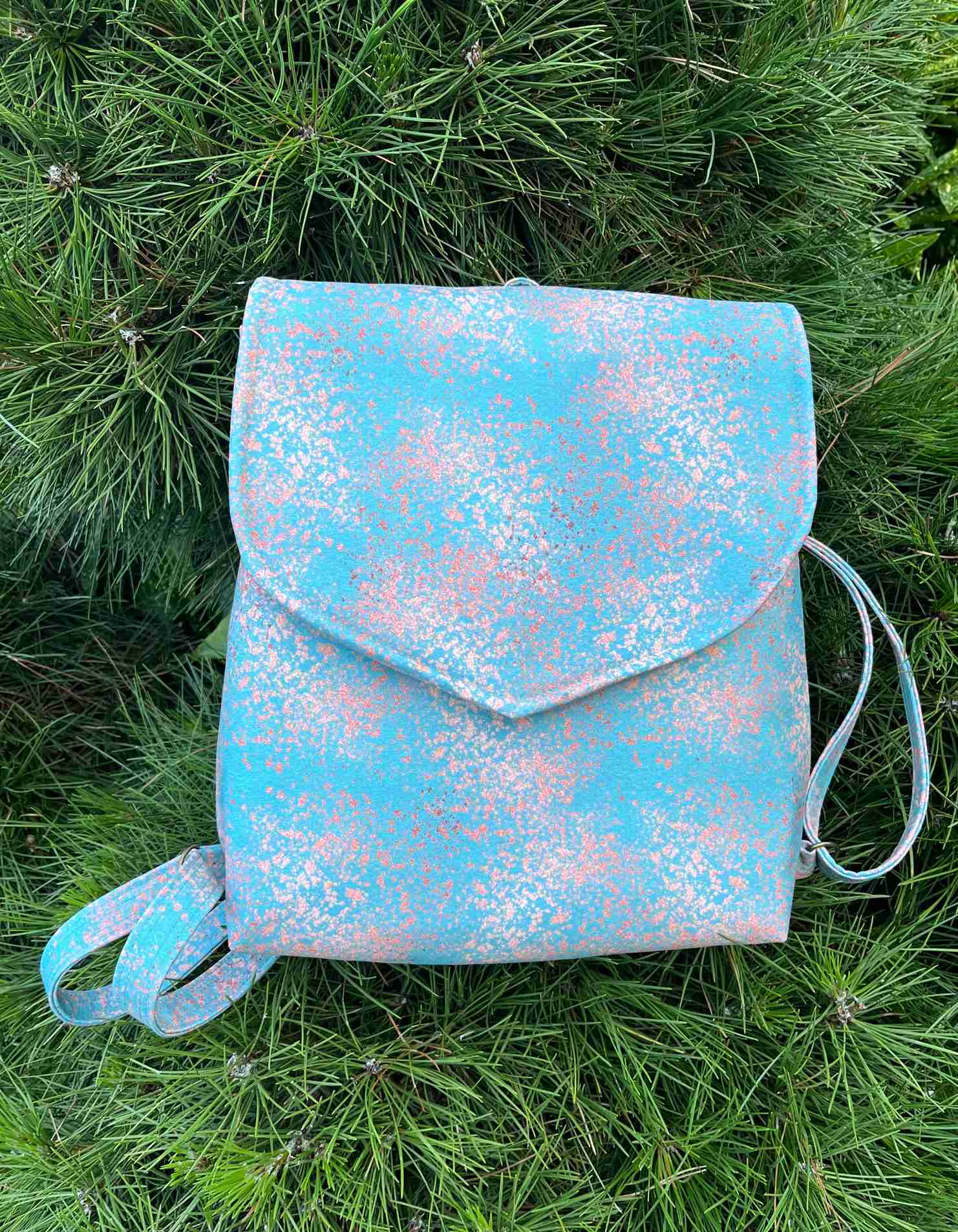 Batůžek Bellini je dle střihu Martini Alblové MAD design, ušitý je v mintové/mátové barvě ze softsheelu - venkovní strana a jako vnitřní látka je použito balvněné plátno v krásné světle modré. Batoh je vyztužený, aby krásně držel tvar, ale měkký, velice elegantní. Popruhy jsou nastavitelné. Batoh je uzavíratelný magnetickým zapínáním na klopě. V horních bočních částech batohu jsou umístěny dva magnety, které slouží ke zúžení batohu. Barva batůžku je mintová/ mátová se zlatou patinou. Barevnost je jemná a velmi zajímavá.