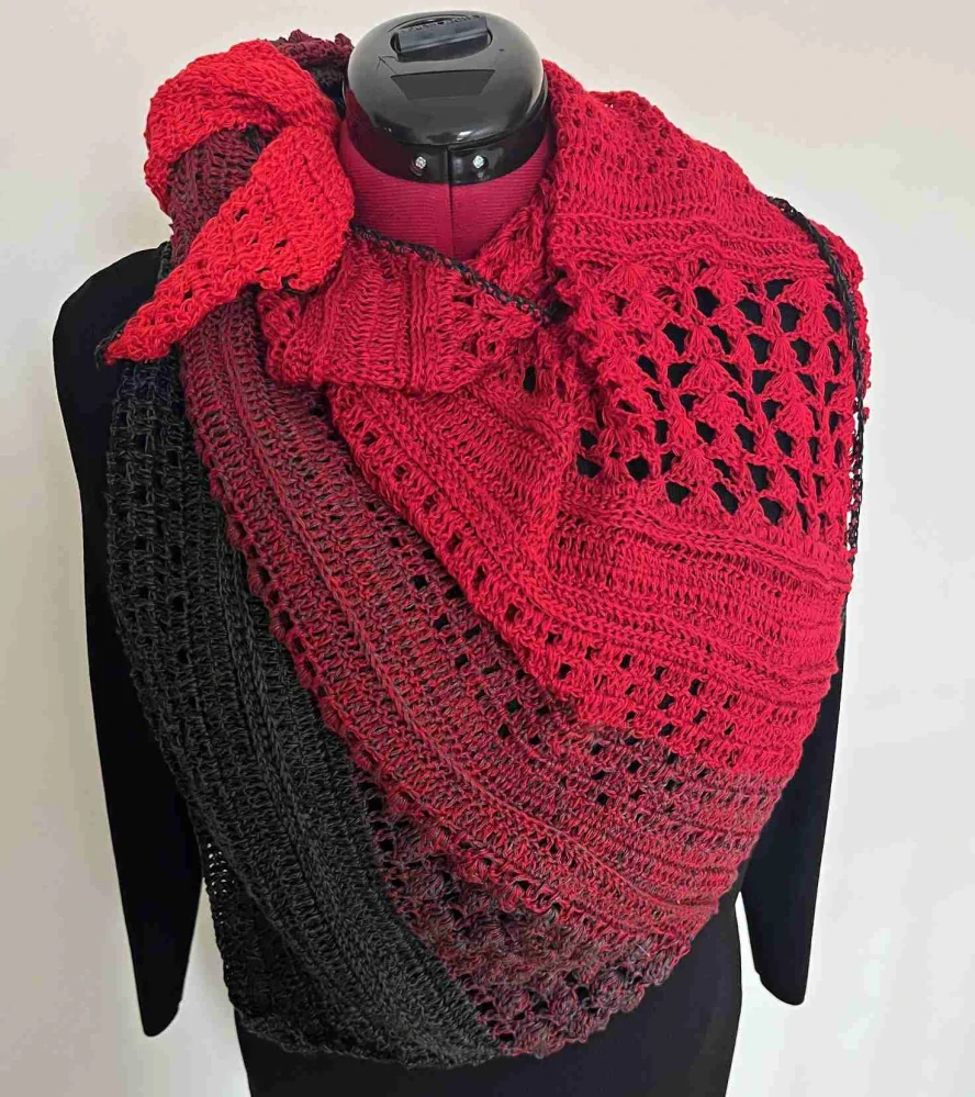 Háčkovaný šátek sytá červená po černou, asymterický tvar