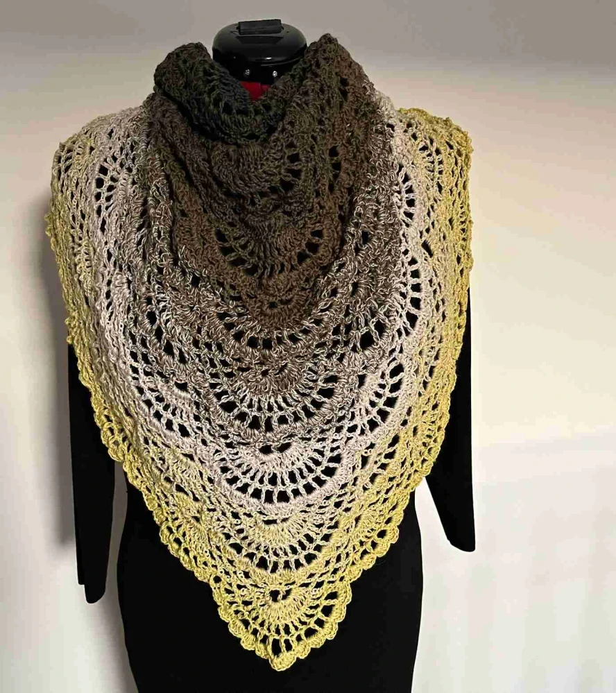 Háčkovaný šátek tmavá hnědozelená krémová žlutozelená