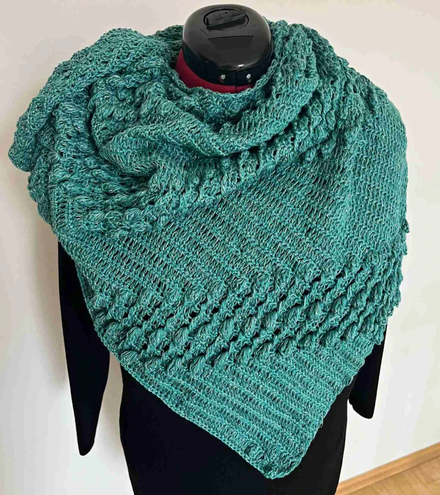 Háčkovaný šátek Butterfly modrozelený asymetriký