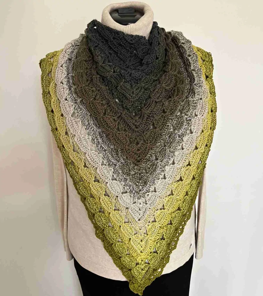 Háčkovaný šátek od žlutozelené přes béžovou po tmavě hnědozelenou
