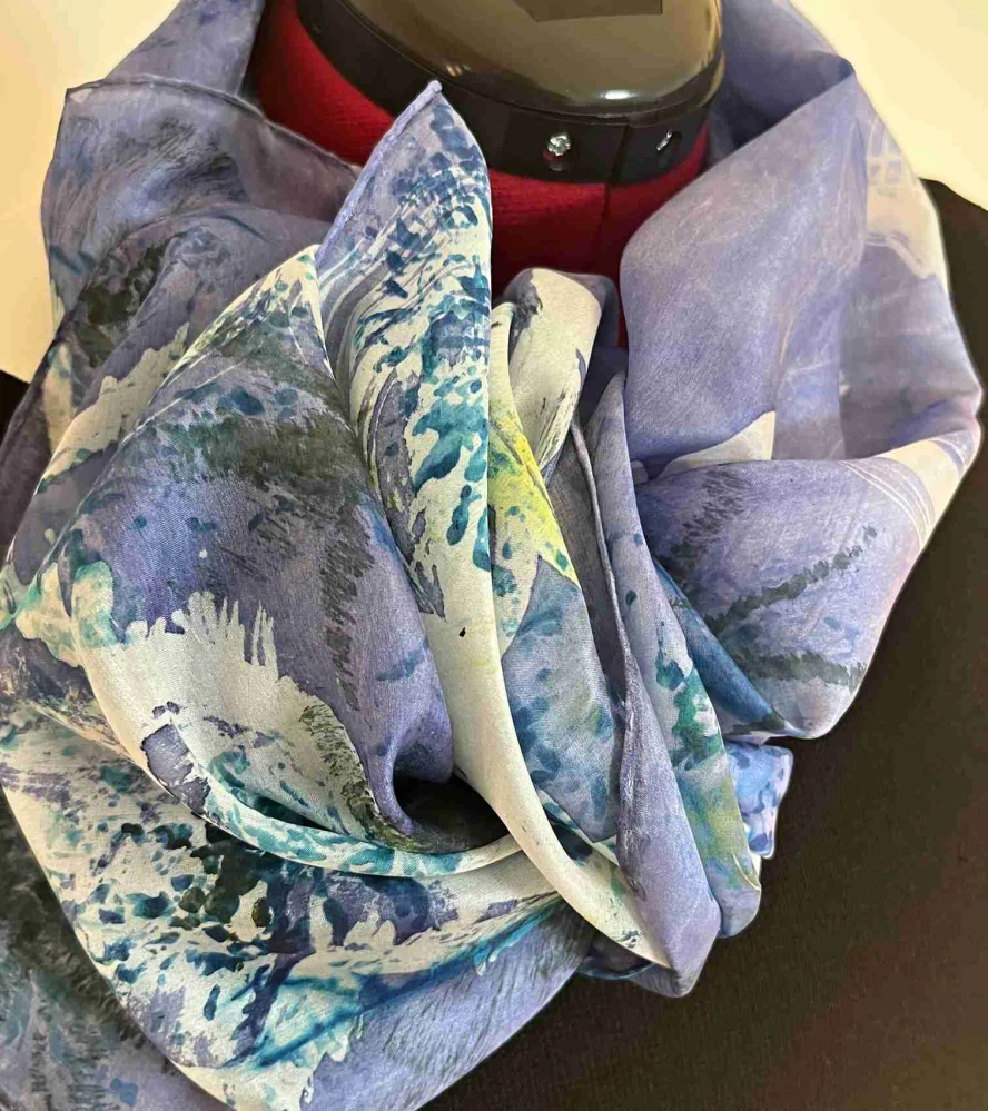 Šál kreslený prolínáním barev a rezervováním barvy. Pokaždé, když ho uvážete, bude vypadat jinak. Je to luxusní originál, skvělý dárek nebo doplněk k oblečení. Divočina je klidný šátek, spolehlivý přítel, ale přeci v jeho hlubinách něco je... Je krásným doplňkem pro nádhernou ženu.