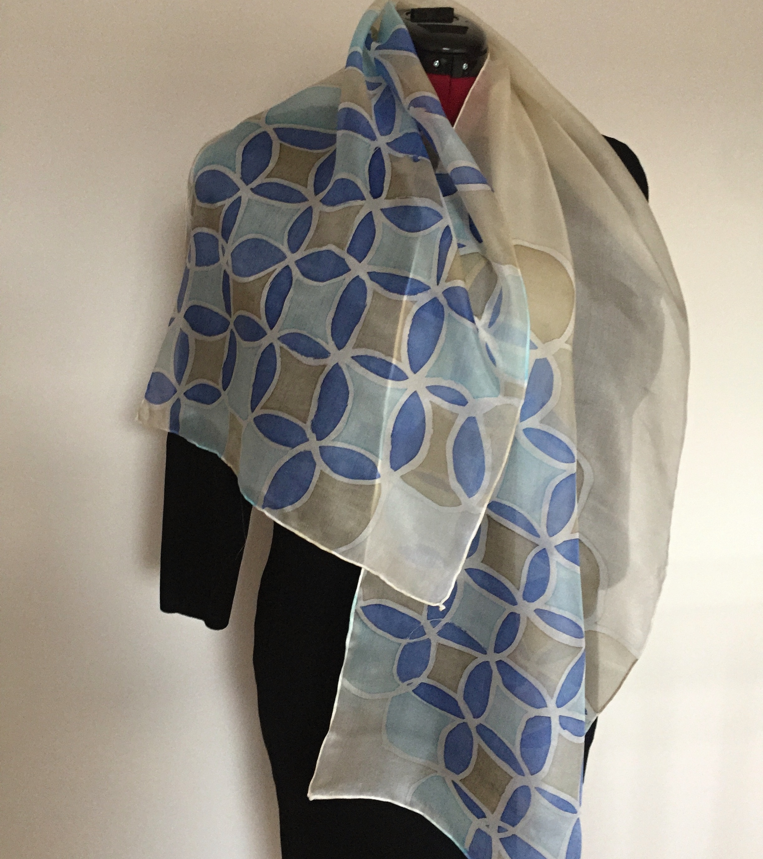 Šál je inspirovaný dlažbou na hradě Pernštejně Pokaždé když ho uvážete, bude vypadat jinak. Je to originál a obsahuje různé odstíny modré a béžové. Potěší každého kdo má rád geometrické tvary.