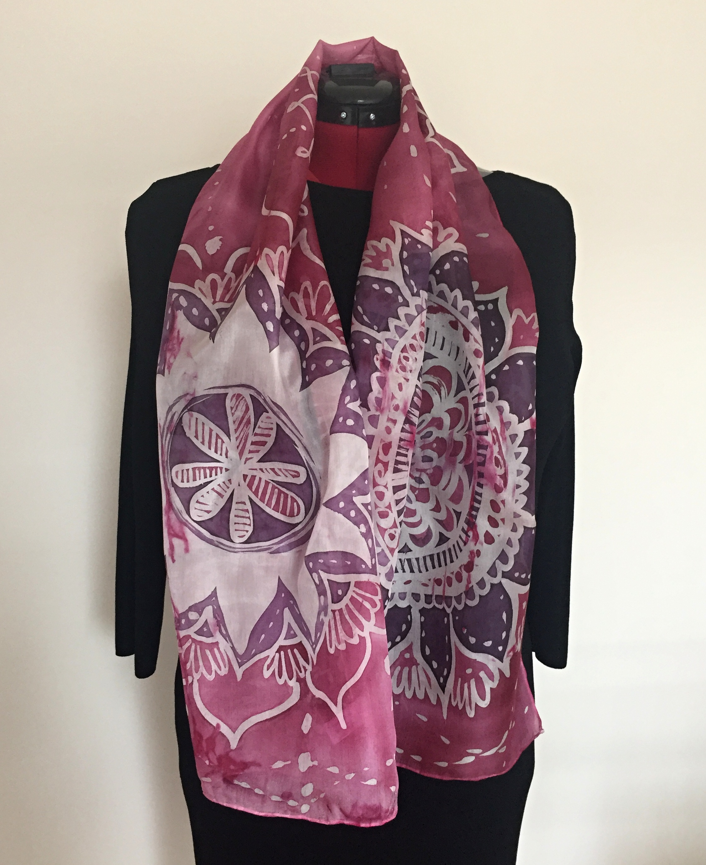 Šál je na každé straně jiný, nesouměrný a kreslený prolínáním barev a voskovou rezervací. Pokaždé když ho uvážete, bude vypadat jinak. Je to originál, výraznější a barvy obsahuje různé odstíny pupurové a bordo a světlé.