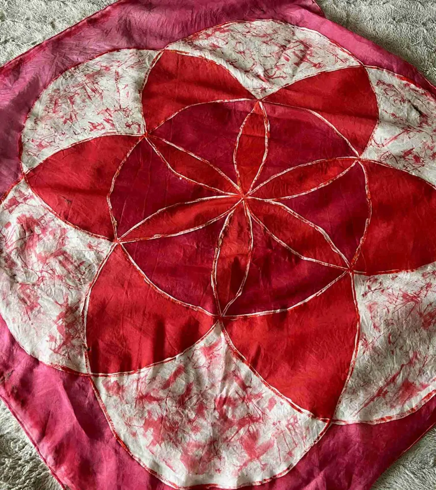 šátek hedvábný o rozměru 90x90cm, je to lehounký materiál označovaný jako Ponge 5. Šátek je namalován barvami Javana a horkým voskem rezervační technikou.