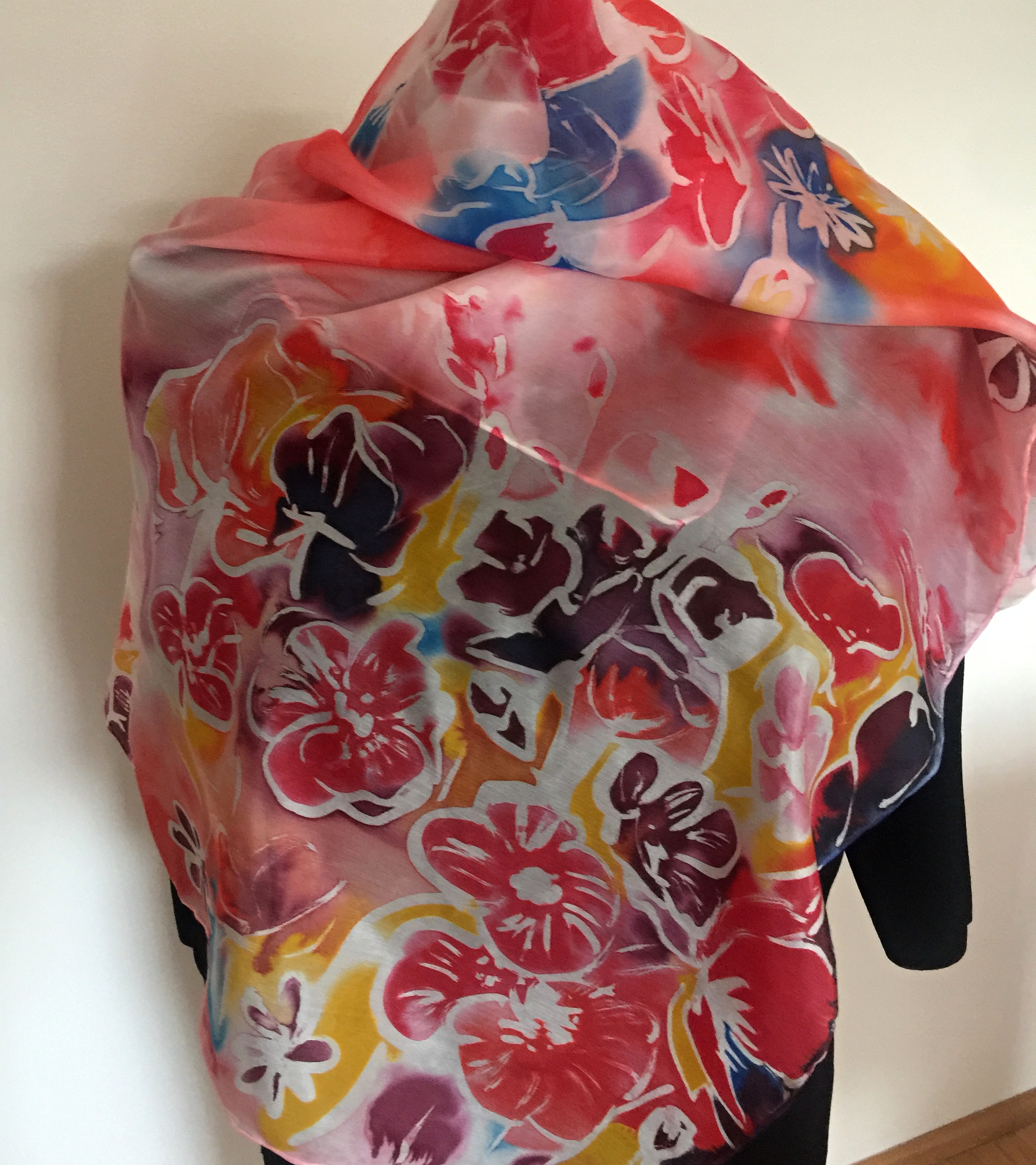 šátek hedvábný o rozměru 90x90cm, je to lehounký materiál označovaný jako Ponge 5. Šátek je namalován barvami Javana a horkým voskem rezervační technikou.