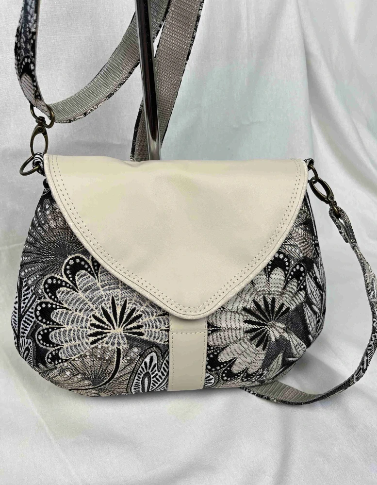 Kabelka Colette je dle střihu Pepitty, ušitá z pevnější látky a to venkovní strana, klopa je z kůže v krémové barvě. Jako vnitřní látka je použito balvněné plátno. Kování je použito v barvě staré mosazi. Kabelka je vyztužená, aby krásně držela tvar, ale byla stále měkká a velice elegantní. Popruh je nastavitelný, dá se nosit na rameni nebo křížem. Collete je uzavíratelná magnetem na klopě, uvnitř tašky je vnitřní kapsa na zip. Barva malé kabelky Colette je krémová s květy