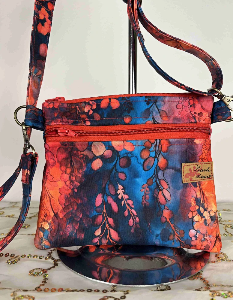 Kabelka Maličká je dle střihu Pepitty, ušitá z pevnější látky softshell a to venkovní strana. Jako vnitřní látka je použito balvněné plátno. Kabelka je vyztužená, aby krásně držela tvar, ale byla stále měkká a velice elegantní. Popruh je nastavitelný, dá se nosit na rameni nebo křížem. Maličká je uzavíratelná zipem. Na přední straně je kapsa na zip. Barva Maličké je v odstínech modré oranožvé a červené - lístky, zip oranžový. Kabelička tak akorát - akorát tak na klíče, mobil, kapesníky a lesk nebo menší peněženku.