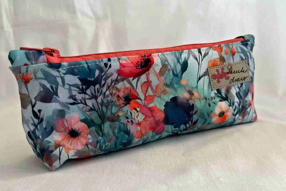 Penálek na tužky je ušitý dle střihu Pepitty, nevyztužený, pojme překvapivě velké množství tužek včetně menší myšky k počítači. Je lehký a vhodný pro větší slečny a dámy. Dá se použít i na prášky, kosmetiku dle fantazie. Barva barevné květy s oranžovým zipem.