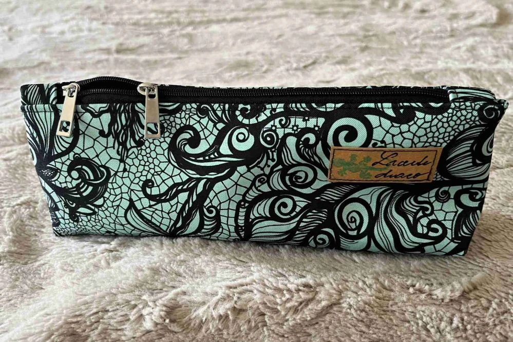 Penálek na tužky je ušitý dle střihu Pepitty, nevyztužený, pojme překvapivě velké množství tužek včetně menší myšky k počítači. Je lehký a vhodný pro větší slečny a dámy. Dá se použít i na prášky, kosmetiku dle fantazie. Barva černá krajka na mintové.