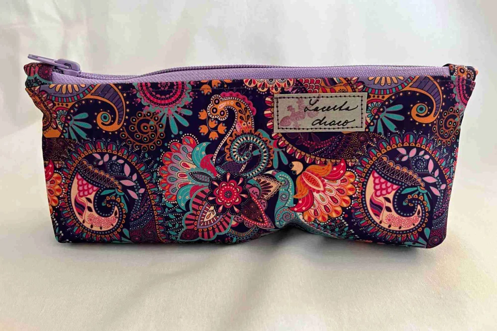 Penálek na tužky je ušitý dle střihu Pepitty, nevyztužený, pojme překvapivě velké množství tužek včetně menší myšky k počítači. Je lehký a vhodný pro větší slečny a dámy. Dá se použít i na prášky, kosmetiku dle fantazie. Barva fialová barevná se vzorem paisley