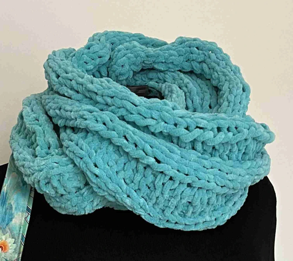 Nákrčník pletený ze silnější žinylkové vlny Dolphin baby. Barva je tyrkysová. Šálu dvakrát pohodlně omotáte kolem krku, je velice příjemná a měkká.