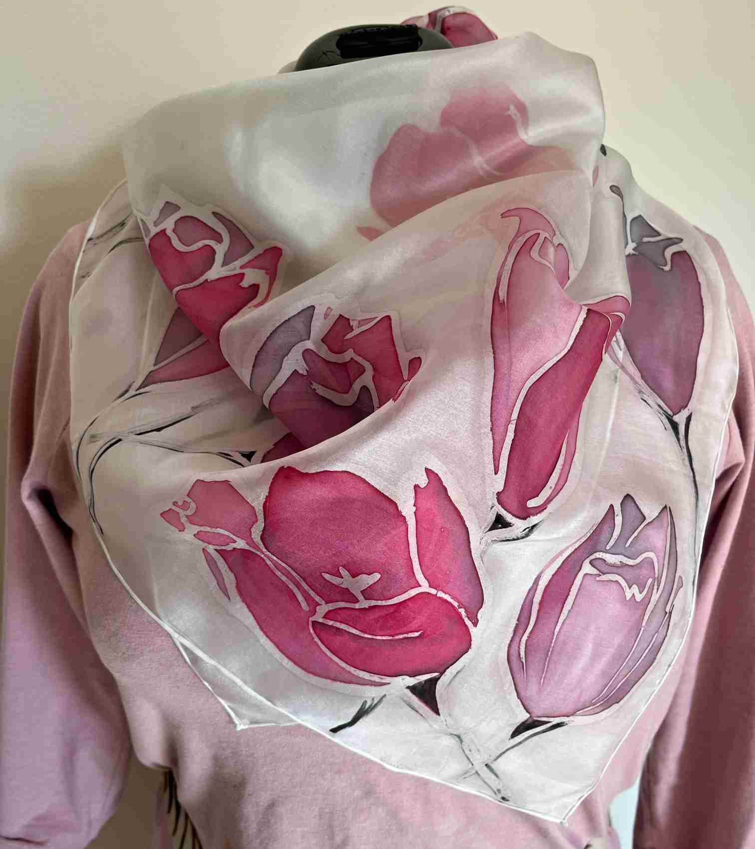 Šátek kreslený prolínáním barev a rezervováním barvy. Pokaždé když ho uvážete, bude vypadat jinak. Je to originál, barevně je v odstínech ružové a šedé na bílém podkladu. Připomíná jemnost a ženskou krásu, kterou vidíme v tulipánech.