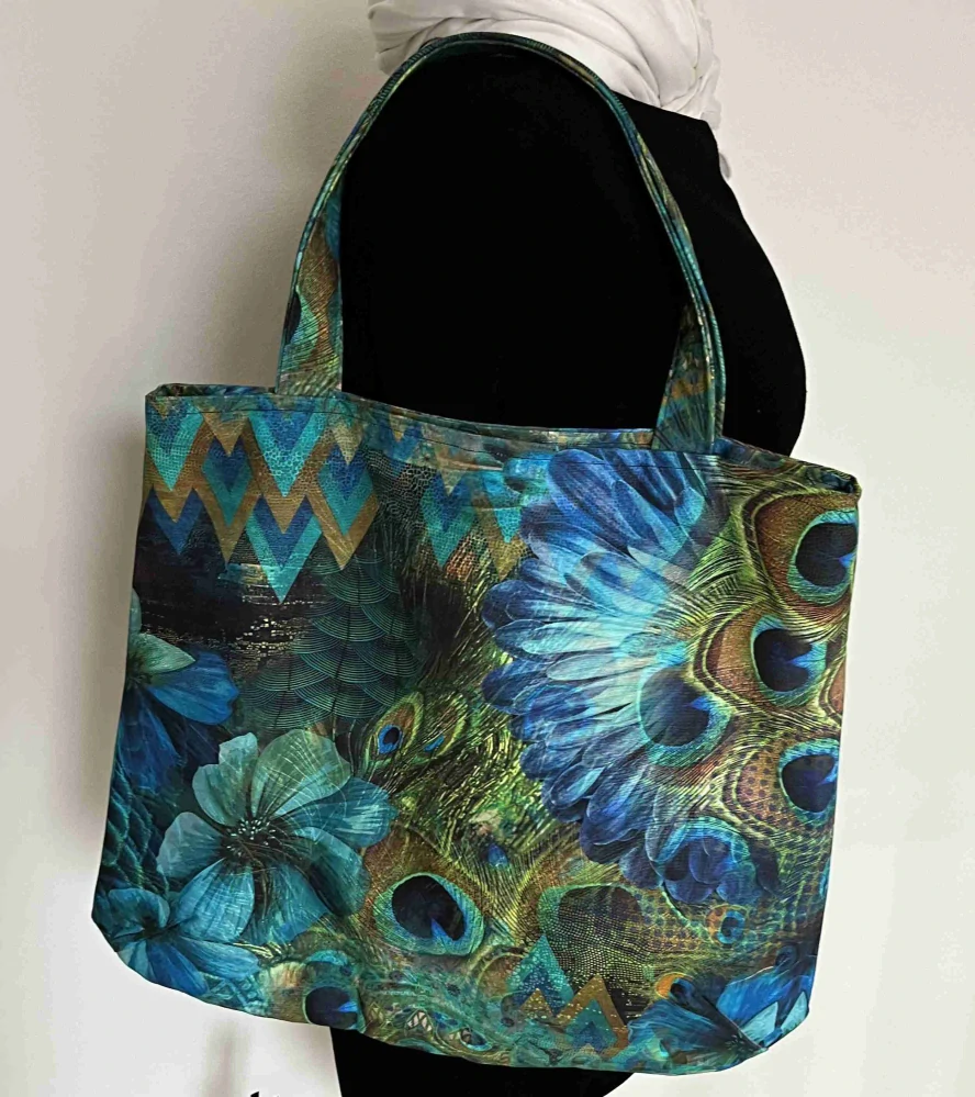 Vzor této tašky jsou Květy a paví pera v odstínech modré, vnitřní taška modrá drobný vzor podobný vrchnímu, materiál kanvas. Taška je velká, prostorná s možností nosit v ruce i přes rameno. Rozměry jsou výška 43 cm, šířka nahoře 45cm, šířka dole nad zúžením 52cm, hloubka je 2cm v položeném stavu, jinak je taška velmi prostorná a pojme knížku, ručník, pití a ještě zbyde místo nebo větší nákup. Materiál je 100% bavlna Kanvas, Kanfas. Kanvas je hrubší bavlněná tkanina v plátnové vazbě v gramáži mezi 180-225 g/m2.