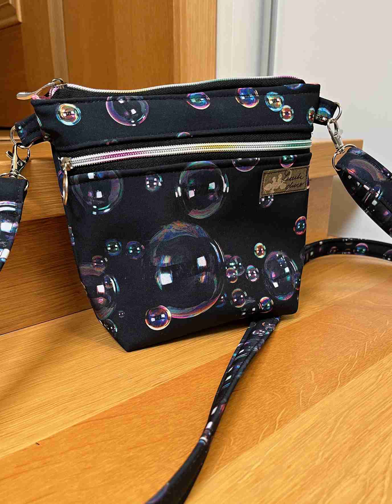 Kabelka Maličká je dle střihu Pepitty, ušitá z pevnější látky softshell a to venkovní strana. Jako vnitřní látka je použita bavlněná látka. Kabelka je vyztužená, aby krásně držela tvar, ale byla stále měkká a velice elegantní. Popruh je nastavitelný, dá se nosit na rameni nebo křížem. Maličká je uzavíratelná zipem. Na přední straně je kapsa na zip. Barva Maličké je černá s bublinkami. Kabelička tak akorát - akorát tak na klíče, mobil, kapesníky a lesk nebo menší peněženku.
